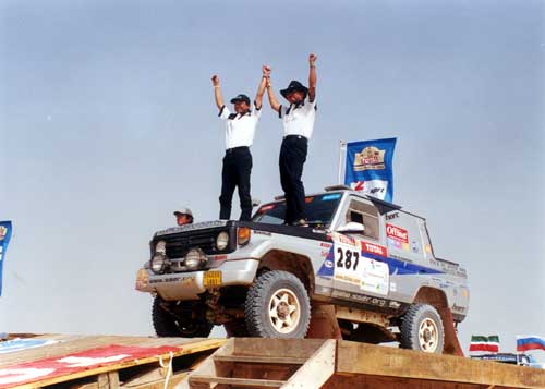 何とかダカールのラック・ロゼにゴールしたボクタチ。なかなか苦しい道のりでした。車検当日のエンジン積み替え!!ミッション・デフ・燃料系の日替わりトラブル。などなど、ゴールする頃にはバッチリなクルマになってました。でも最終日3速がなくなって、ラックロゼ周囲のデューンで「ビクビク!」なかなかルートも厳しくておもしろい大会でした。